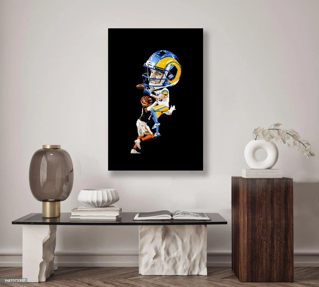 Original painting of Cooper Kupp of the Los Angeles Rams catching the game winning touchdown in Super Bowl LVI. Acrylic on stretched canvas. Measures 20" x 30" and is approximately .5" inch deep.