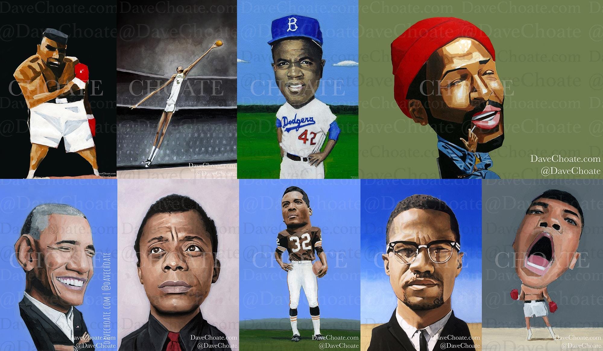 SALE. Black History Leaders - 9 4x6 Prints for 27 dollars. Muhammad Ali 2, Bill Russell, Jackie Robinson, Obama, James Baldwin, + Malcolm X